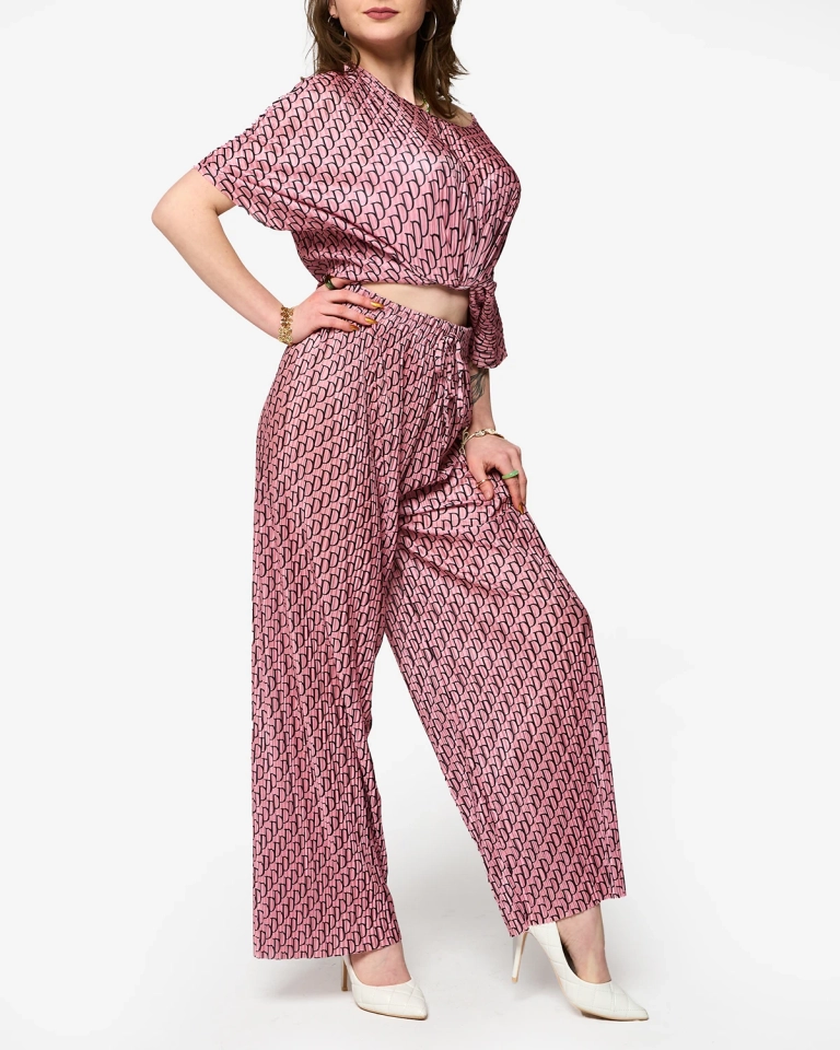 Тъмнорозов дамски плисиран комплект с десен - Облекло