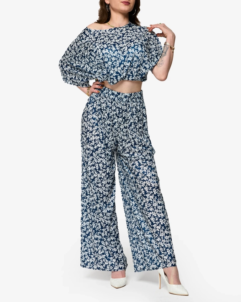- Дамски цветен комплект, изработен от хлъзгава плисирана материя. Блузата с кръгло деколте е с къси ръкави. Панталонът тип палацо с широка гордост на мястото на талията и декоративни връзки. ЗАБЕЛЕЖКА: Точност на измерването (+/-) 1 см.