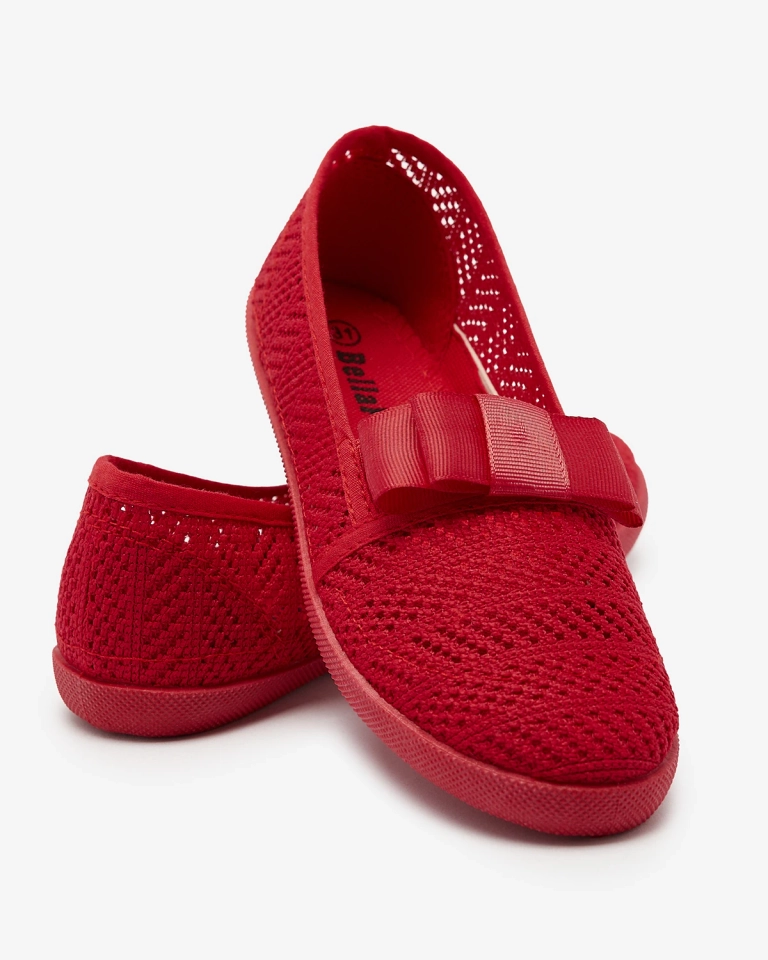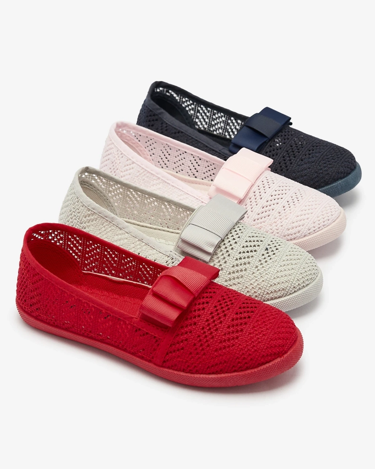 - Красиви момичешки кецове с панделка. Горната част е изработена от ажурен текстилен материал, стелката също е от плат. Чифтът е украсен с очарователна панделка отпред. Освен това обувките имат гумена вложка за лесно приплъзване на крака в обувката.