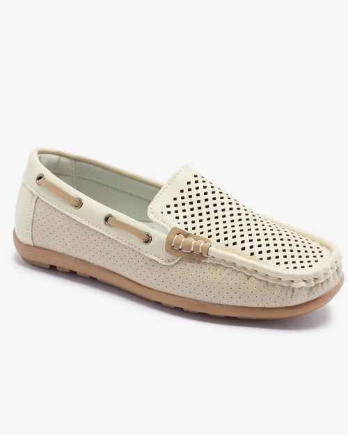 - Модерни детски мокасини, изработени от екокожа. Горната част е с ажурно покритие. Стелката е подплатена с естествена кожа. Те ще бъдат идеални за ежедневно носене.