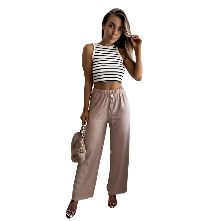 Светлокафяв дамски широк панталон с ребра - Облекло