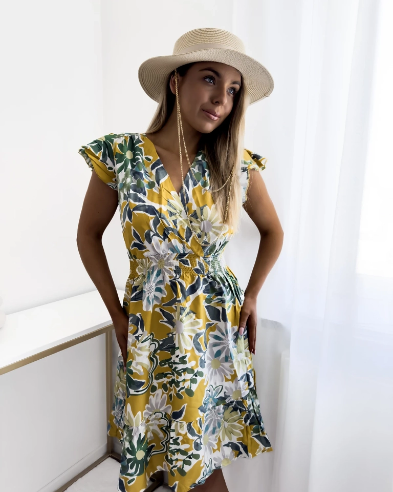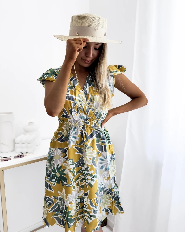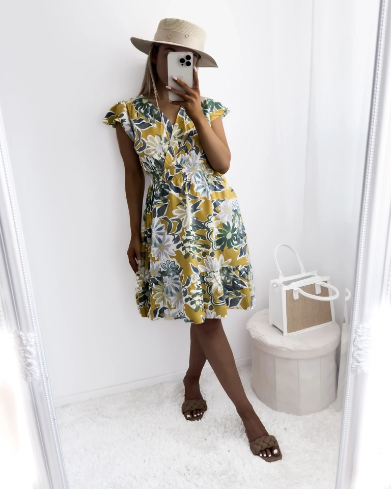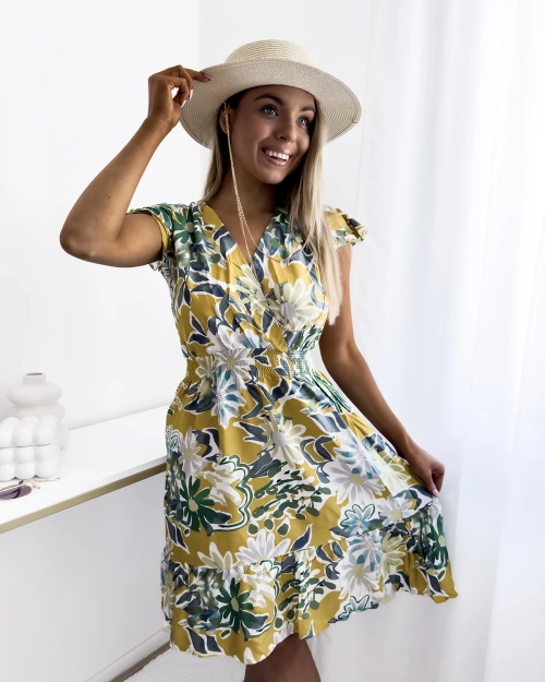 Горчица Дамска мини рокля с флорален принт - Облекло