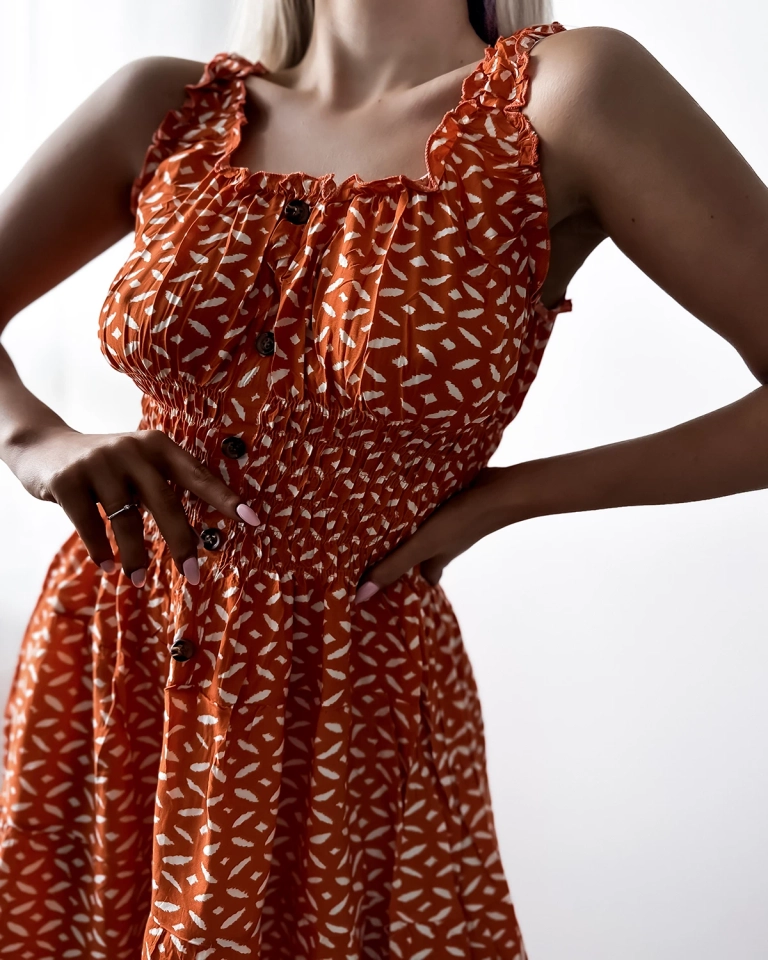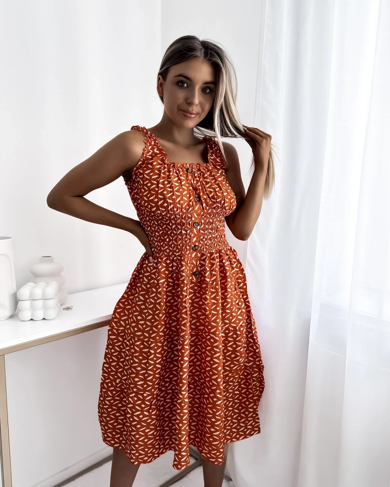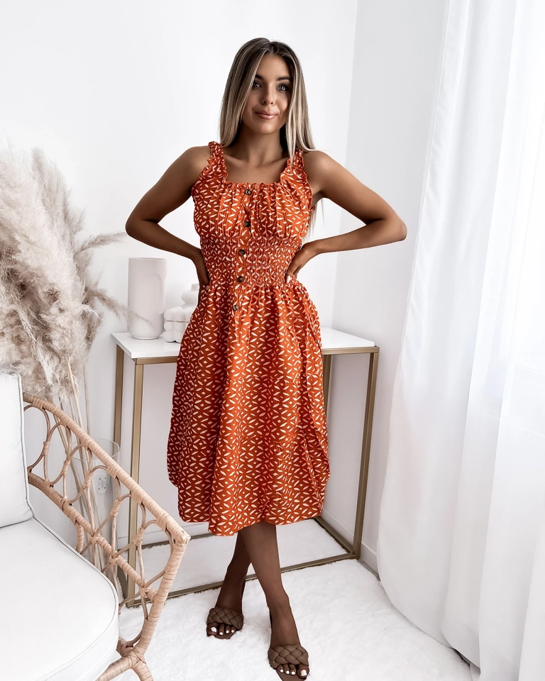 Дамска рокля с дължина до коляното и принт в оранжево- Облекло