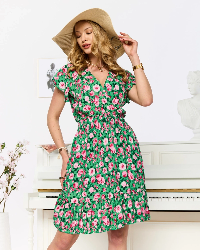 Къса дамска рокля с принт в зелено и розово - Облекло