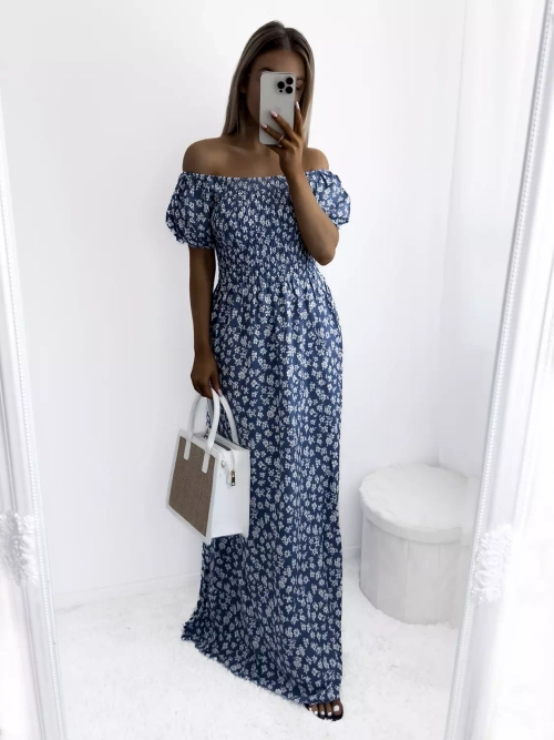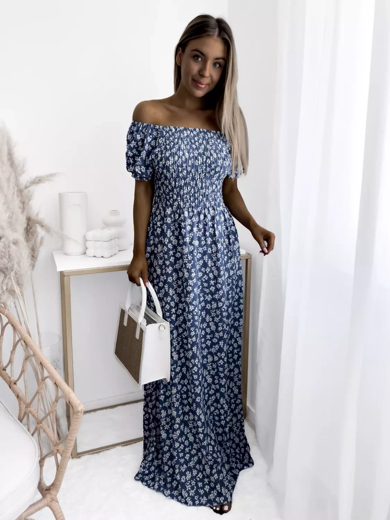 - Страхотна дамска дълга рокля от лека материя, украсена с флорален десен. Моделът е с кръгло деколте а'ла испанка, има къси ръкави и ластик по ширината на бюста и талията. Трябва да имате през този сезон! ЗАБЕЛЕЖКА: Точност на измерването (+/-) 1 см.