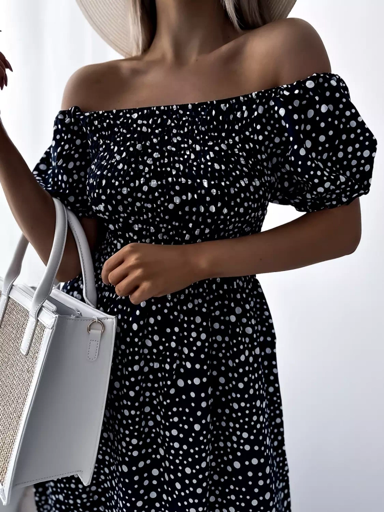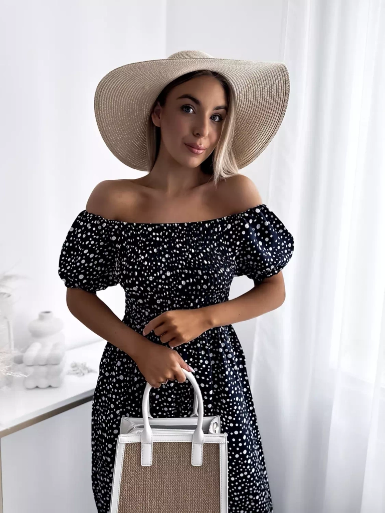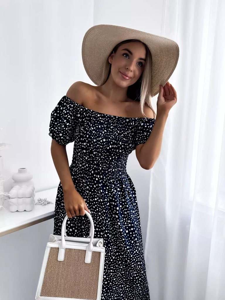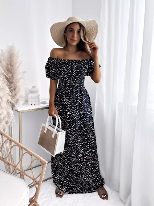 - Пролетна дамска макси рокля с грах, изработена от памучна материя. Моделът е с кръгло деколте а'ла испанка и ластик по ширината на бюста и талията. Модел с къси ръкави. Облечете я за разходка! ЗАБЕЛЕЖКА: Точност на измерването (+/-) 1 см.