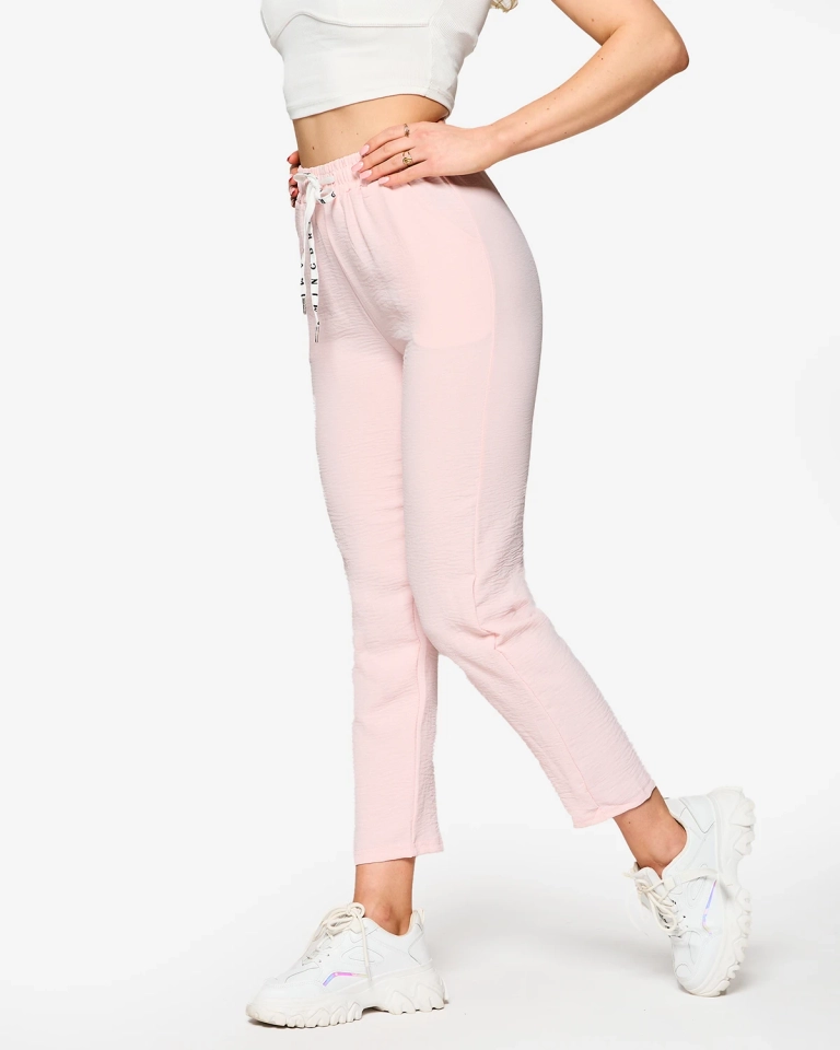 - Ефирен прав дамски панталон от лек плат. Моделът е с ластик и връзки на талията и два джоба. Удобен и комфортен! ЗАБЕЛЕЖКА: точност на измерване (+/-) 1 см.