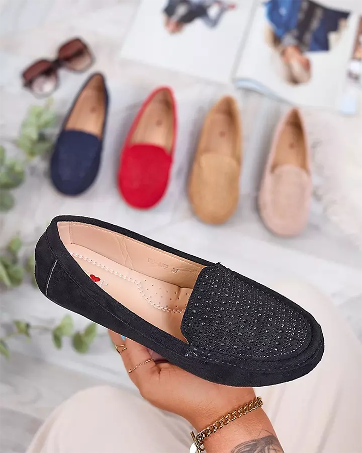 - Модерни дамски мокасини, украсени с малки циркони в подходящ цвят. Горната част е изработена от органична кожа велур, с мека омекотена стелка отвътре. Супер допълнение към вашите ежедневни тоалети!