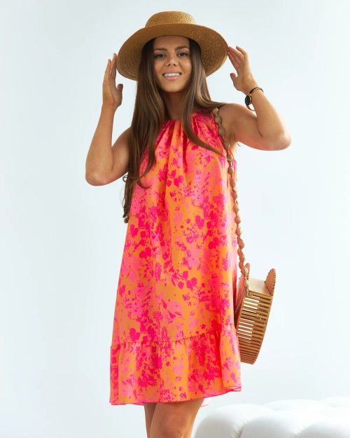 Royalfashion Оранжево-розова къса дамска рокля с цветя