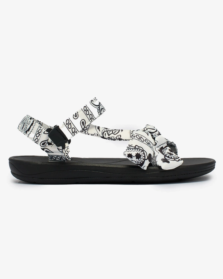 • Спортни дамски сандали с гумена подметка. Каишките са изработени от текстилен материал с принт и са украсени с панделка. Представените дамски обувки се закопчават с велкро каишки. Те прилепват добре към крака!