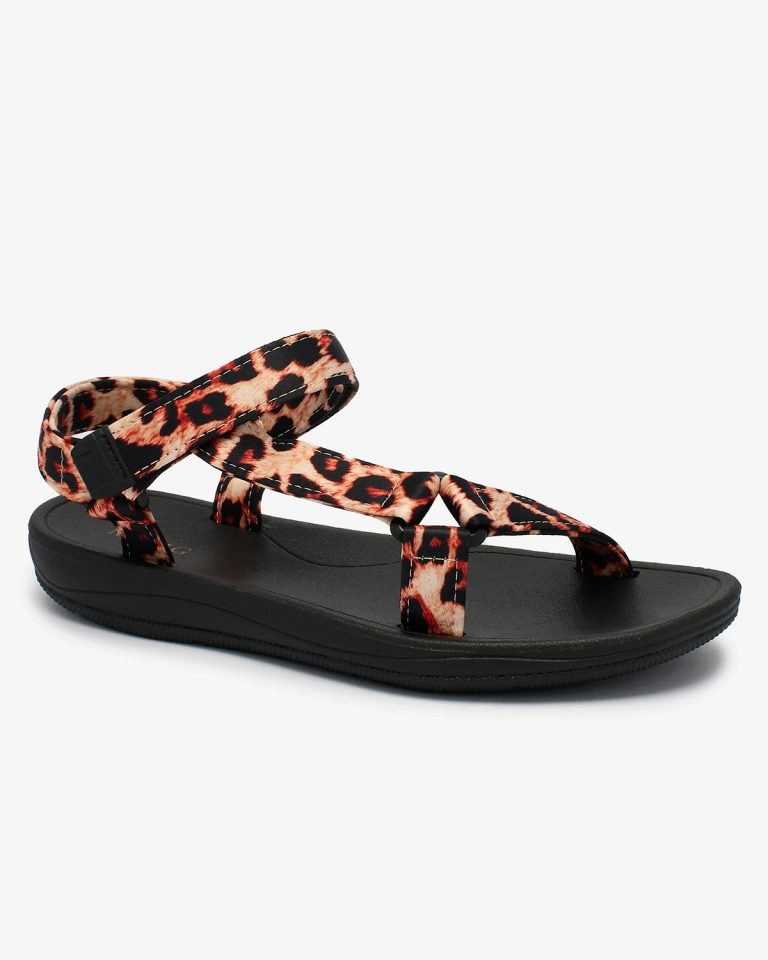 - Дамски сандали от текстилен материал, декорирани с леопардова шарка. Удобна плоска гумена подметка. Обувките се закопчават с велкро каишки. Перфектни за ежедневно носене!