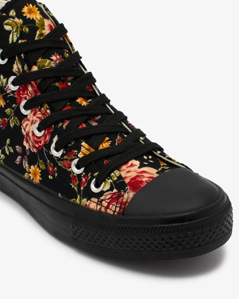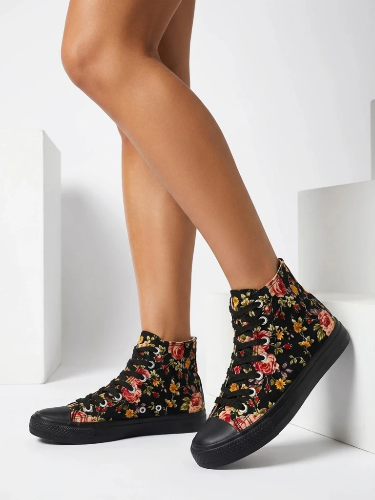 - Дамски високи маратонки от текстилен материал на гумена подметка. Завързани с дантела, те осигуряват перфектно прилягане. Декорирани с флорален принт, те придават чар и летен характер. Перфектни за ежедневния стайлинг!