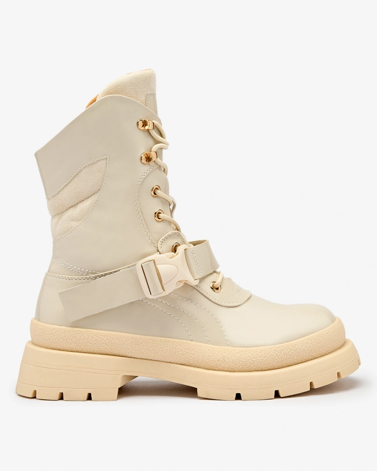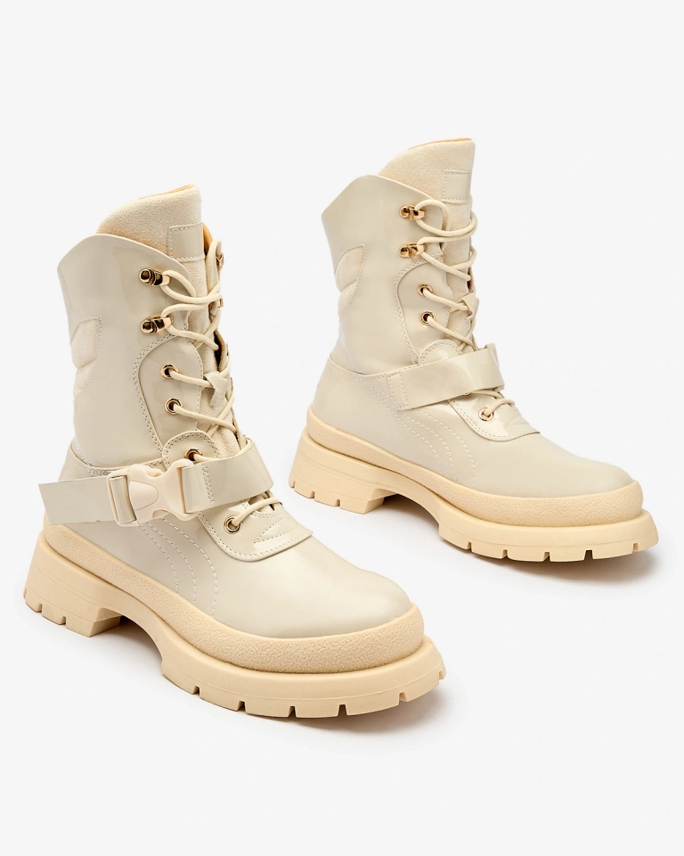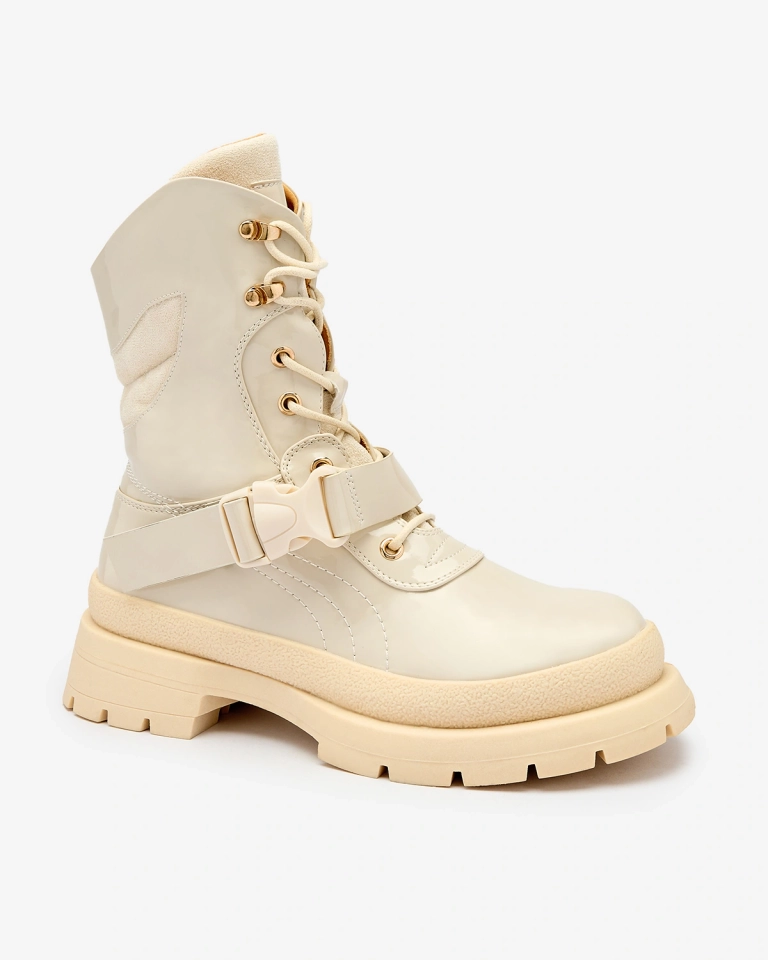 - Дамски ботуши с по-дебела подметка, изработени от еко кожа с лак. Средата е подплатена с тънка пяна, а стелката е изработена от плат. Модел с дантела и допълнителна катарама. БЕЖОВИ ДАМСКИ БОТУШИ БЕЗ ПОДГРЯВАНЕ SETOGY