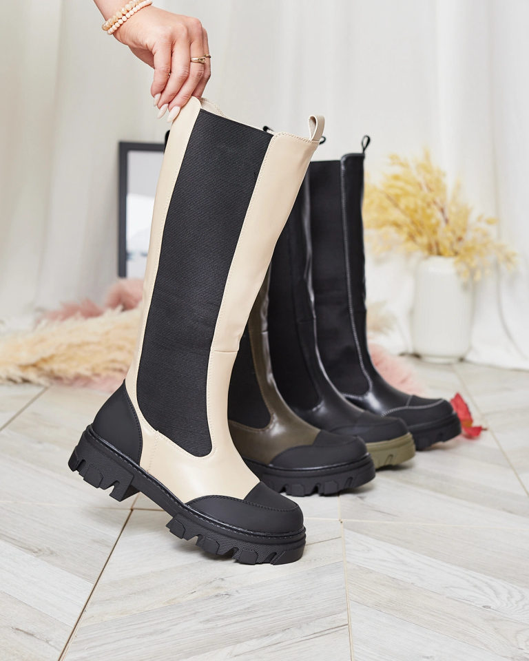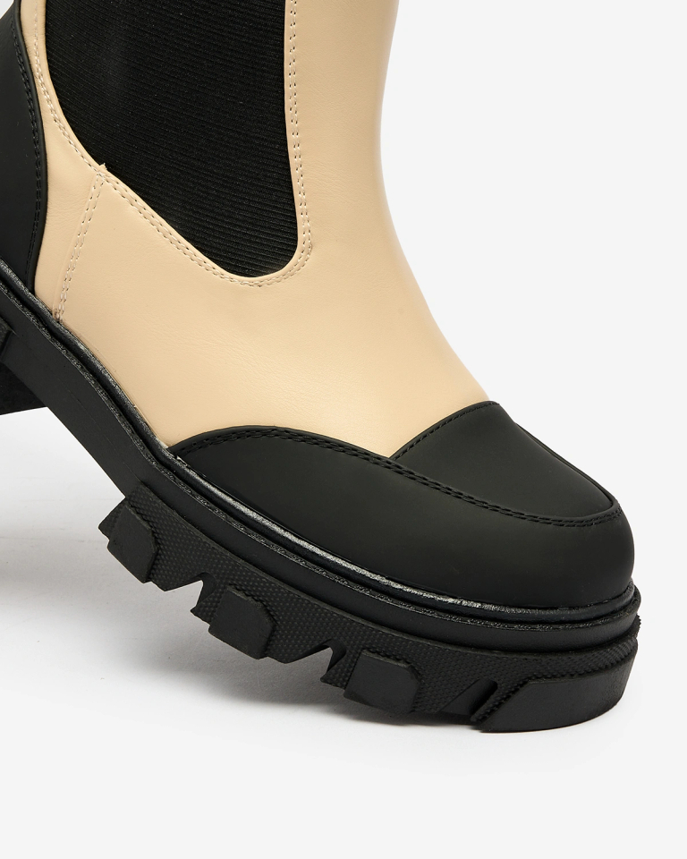 • Дамски ботуши до средата на прасеца, изработени от еко кожа с текстилна стелка. Моделът е на плосък ток. Декоративни матови вложки от еко кожа на носа и петата. Обувки с цип и еластична вложка отстрани.