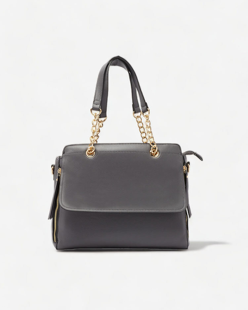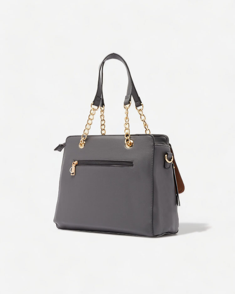 - Класическа дамска чанта от екокожа с дръжки с верижка и подвижна каишка. Чантата с вътрешна част от плат, закопчаваща се с цип, има 2 отделения и 5 джоба. Циповете в предната част са декоративни.