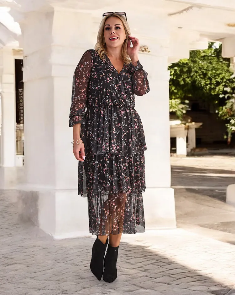 - Дамска миди рокля с принт, изработена от прозрачен материал a'la mesh с подплата. Модел с дълги ръкави и сърцевидно деколте с еластична талия. Перфектна за ежедневно носене!