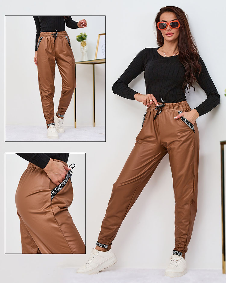 Royalfashion Свободни дамски панталони от екокожа в цвят камила