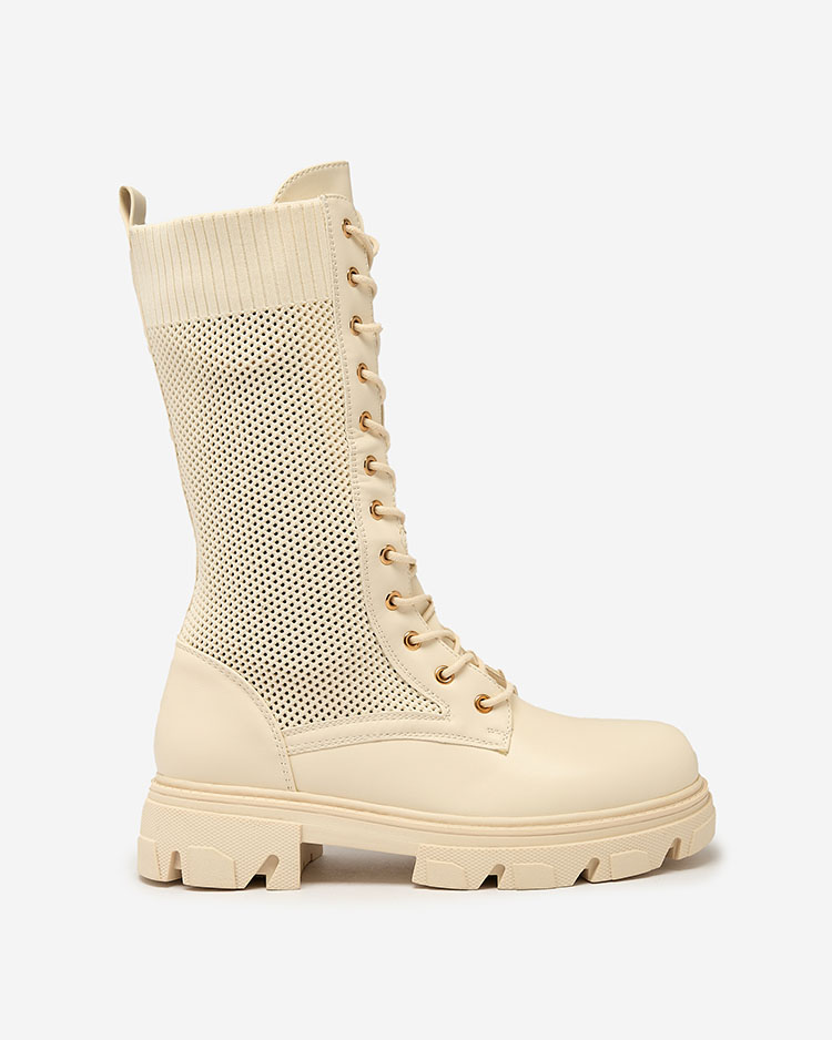 - Дамски ботуши от екокожа, завършени с ажурна горна част от еластична материя. Моделът отвътре има стелка от екокожа. Обувки с дантела. Супер допълнение към есенните ви тоалети!