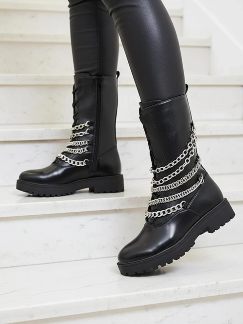 - Дамски ботуши тип "багер" с твърда подметка. Горната част е изработена от органична кожа, украсена с верижки, а отвътре е изолирана с кожа. Моделът е с дантела и цип отстрани. Чудесен избор за по-студените дни!