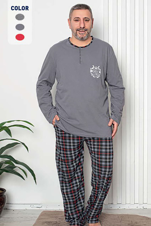 - Удобна мъжка пижама от 2 части с дълги ръкави и дълги крачоли, изработена от памучна материя. Моделът се закопчава с копчета и е украсен с кариран принт. Идеална за домашните вечери! ЗАБЕЛЕЖКА: Точност на измерването (+/-) 1 см.