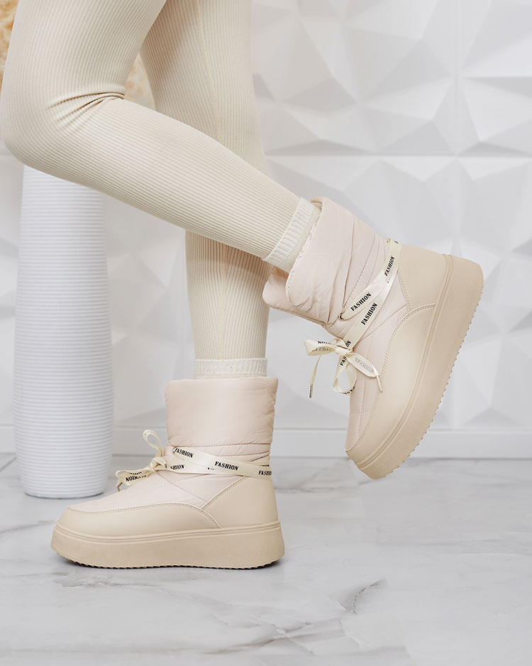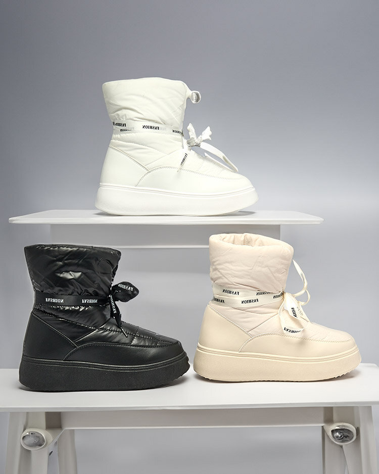 - Сензационни дамски ботуши за сняг. Горната част е изработена от материал a'la cerata и вложки от екологична кожа. Отвътре има затопляне под формата на кожа, обувките се обуват с приплъзване и имат панделка. Перфектни за студения сезон!