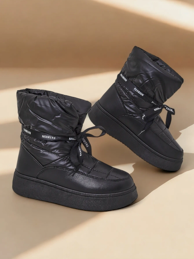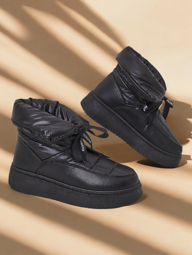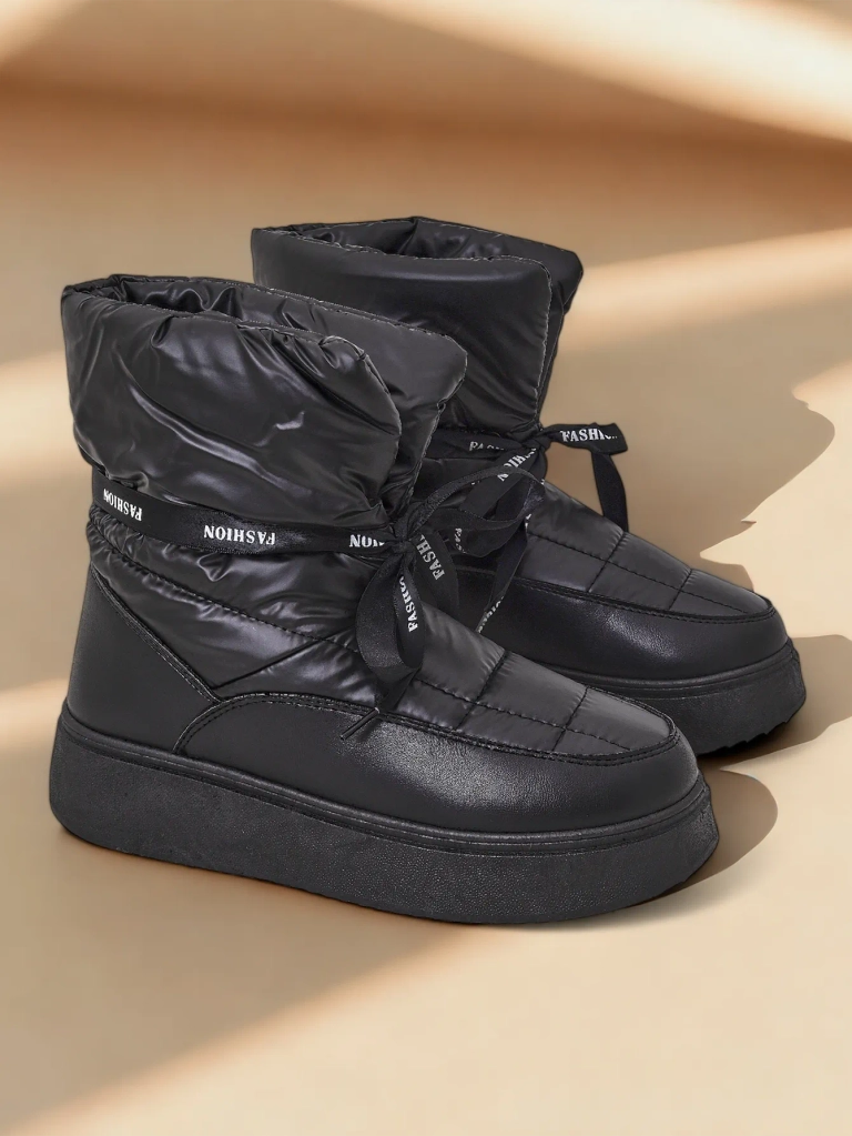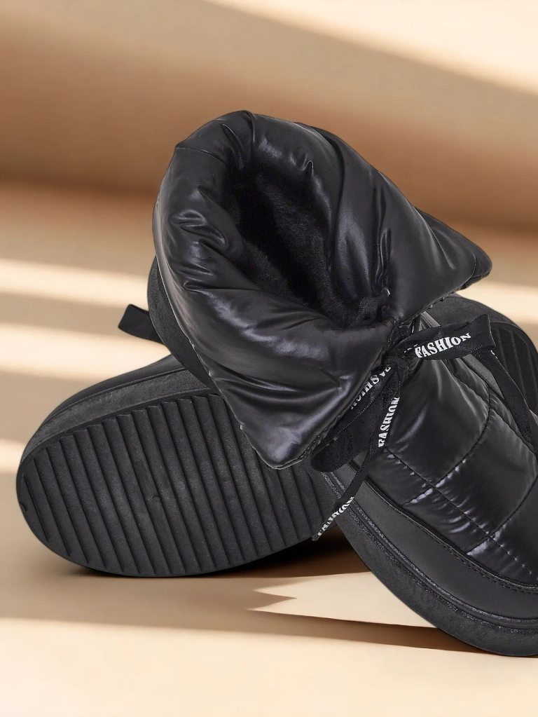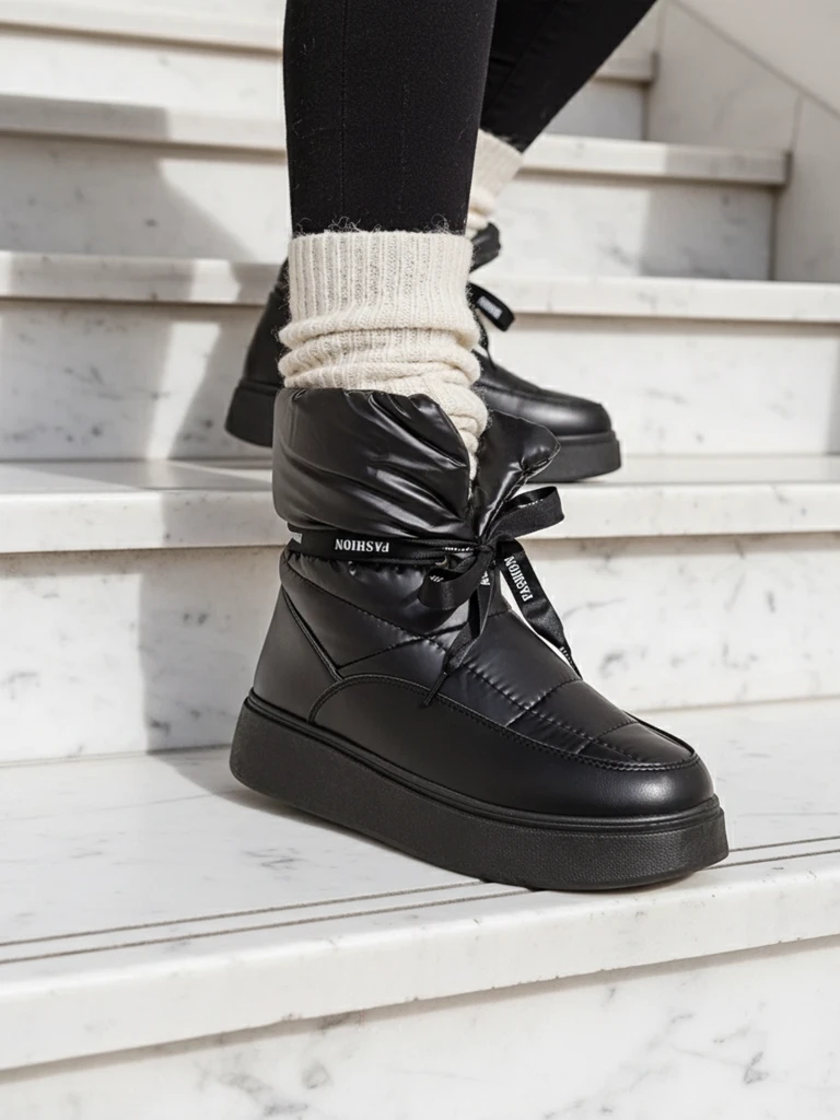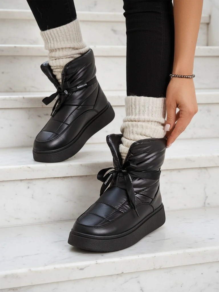 - Сензационни дамски ботуши за сняг. Горната част е изработена от материал a'la cerata и вложки от екологична кожа. Отвътре има затопляне под формата на кожа, обувките се обуват с приплъзване и имат панделка. Перфектни за студения сезон!