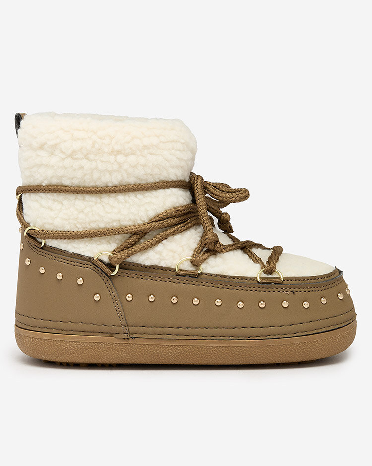 - Затоплени дамски зимни ботуши за сняг с равна подметка. Горната част с дантела, е изработена от комбинация от еко кожа и овча кожа. Изолация под формата на пяна. Перфектната основа за зимата!