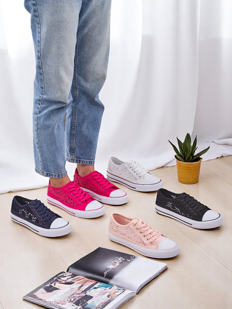 - Дамски обувки с равна подметка. Този модел в ежедневен стил е изработен от текстилен материал с ажурна украса и текстилна стелка. Моделът е с декоративна бродерия. Идеален за тези, които ценят комфорта!