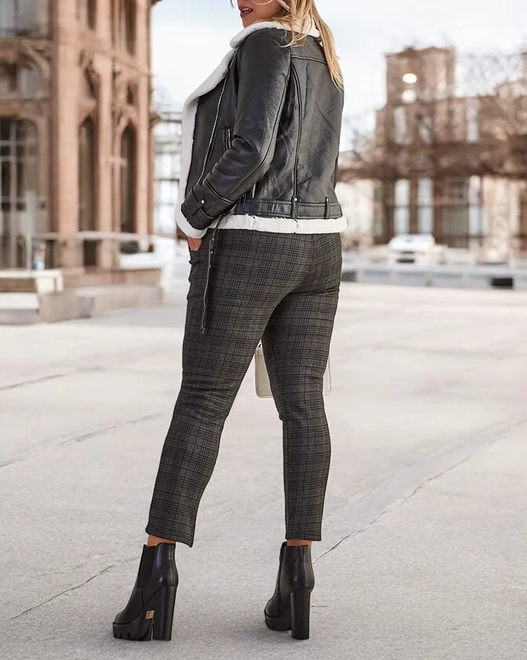 • Дамски панталони с гети, изработени от еластична материя. Моделът е с широк еластичен колан и 2 джоба за приплъзване. Продуктът е изолиран с дебела кожа и украсен с кариран десен. Хит на този сезон!