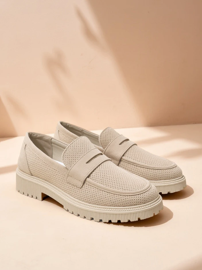 Дамските лоуфъри Callista в бежов цвят са комбинация от стил, комфорт и модерни модни тенденции. Изработени са от висококачествена екологична велурена кожа, която не само изглежда луксозно, но е и щадяща околната среда. Производственият процес на материала отговаря на европейските стандарти за качество и устойчиво развитие - избирайки този модел, вие се грижите не само за собствения си комфорт, но и за околната среда.Обувките имат мека стелка, изработена от дишаща материя, която осигурява отлична дишаемост през целия ден. Плоският ток с височина 4 см е стабилен и удобен, идеален за ежедневна употреба - както по време на разходки, така и за по-дълги излизания. Благодарение на използването на еко велур с микроперфорации, лоуфърите са леки и добре отвеждат влагата.Отличителните черти на лоуфърите Callista са тяхната универсалност и фин дизайн, който можете да съчетаете с много стилове:1. Градски стил – комбинирайте обувките с класически дънки, тениска и кожено яке, за да получите модерен външен вид за всеки ден.2. Офис – комбинирайте лоуфърите с цигарени панталони, светла риза и бежово сако, създавайки елегантна и удобна стилизация.3. Версия за специални поводи – изберете ефирна рокля в пастелни цветове и леки аксесоари, за да подчертаете женствеността на стила.Поддръжката на лоуфърите Callista е изключително лесна – просто редовно отстранявайте замърсяванията с мека четка за велур, а в случай на по-големи петна използвайте почистваща пяна за синтетични материали. След почистване оставете обувките да изсъхнат на проветриво място, далеч от пряка топлина.Лоуфърите Callista са отговор на актуалните тенденции – монохромните, естествени цветове и минималистичните форми са особено модерни през сезоните пролет/лято/есен. Това е идеален избор за жени, които ценят комфорта, функционалността и непреходната елегантност.