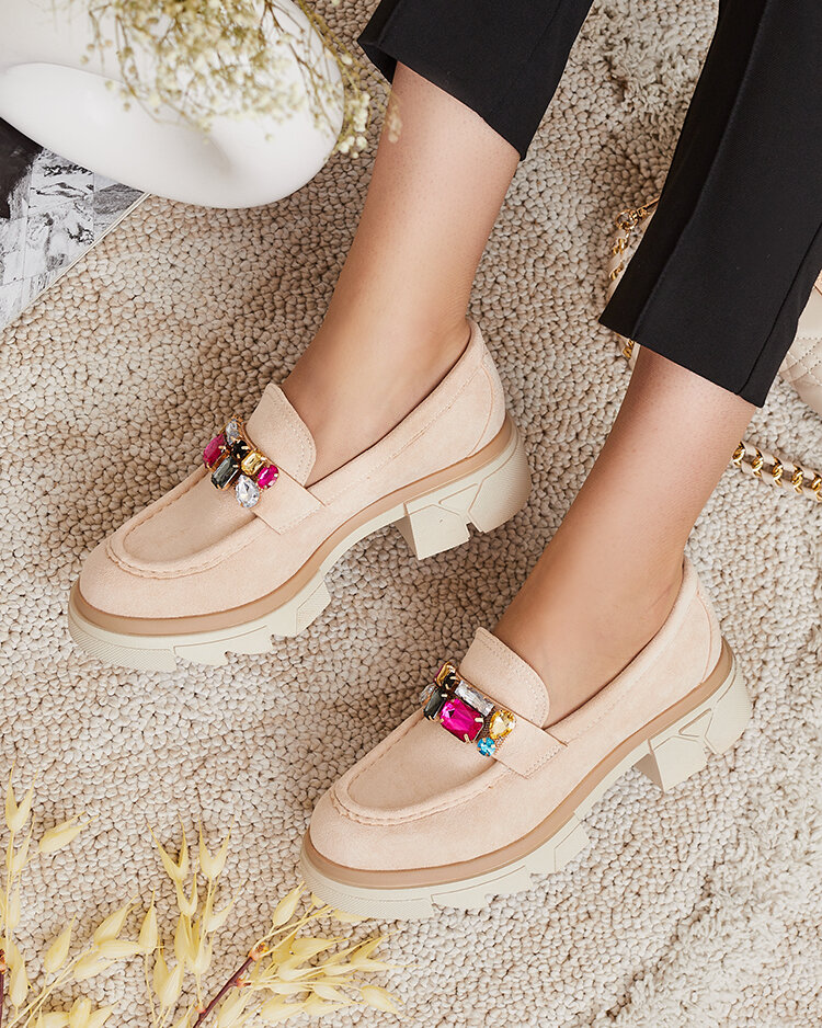 - Красиви дамски мокасини на твърда подметка. Моделът в ежедневен стил и е изработен от органична кожа велур, стелката е от естествена кожа. На носа декорация с цветни камъни. Перфектна основа за много ежедневни визии!