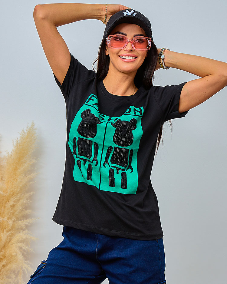 - Ежедневна дамска тениска с щампа и къс ръкав. Изработена от памучна материя. Перфектна основа за много ежедневни визии! ЗАБЕЛЕЖКА: Точност на измерването (+/-) 1 см. Размерите са измерени в плосък ръст.