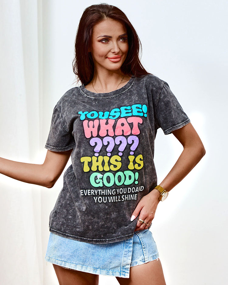 - Ежедневна дамска тениска с щампа и къс ръкав. Изработена от памучна материя. Перфектна основа за много ежедневни визии! ЗАБЕЛЕЖКА: Точност на измерването (+/-) 1 см. Размерите са измерени в плосък ръст.