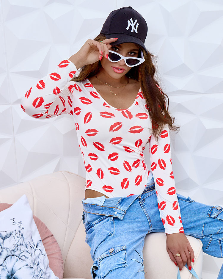 - Подчертаващо фигурата боди с принт, изработено от еластична материя. Моделът е със сърцевидно деколте и дълги ръкави. Скрито закопчаване с кука и примка в областта на разкрача. Модерен избор за всеки ден и за вечерни излизания!
