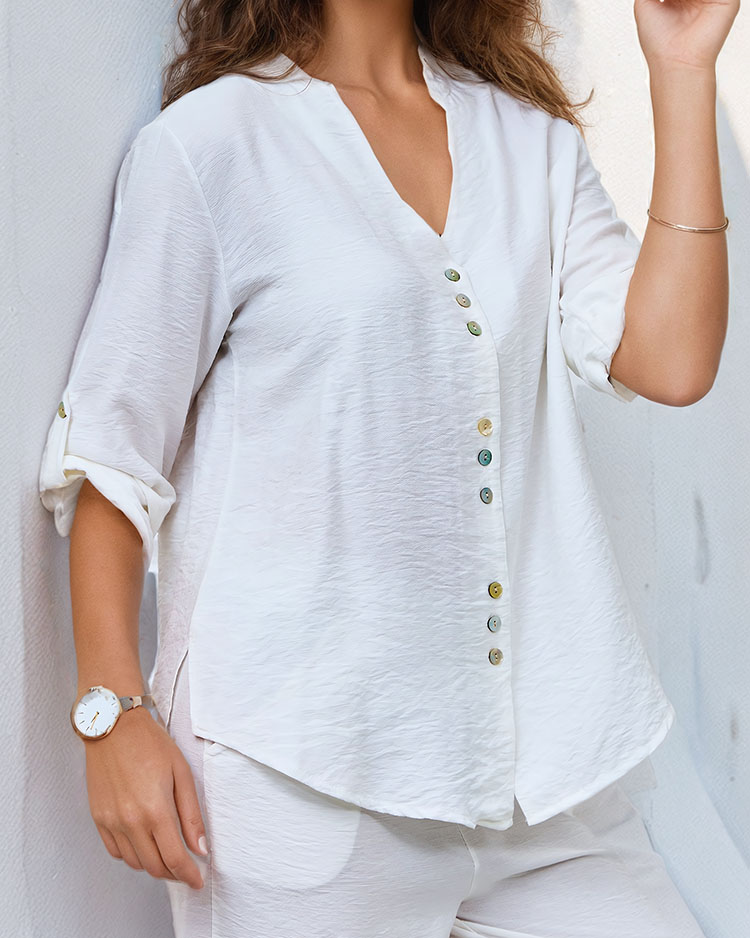 - Ежедневен дамски комплект, изработен от приятен материал. Риза с дълги навити ръкави, закопчана с копчета. Широк панталон с еластична талия, 2 джоба и връзки.