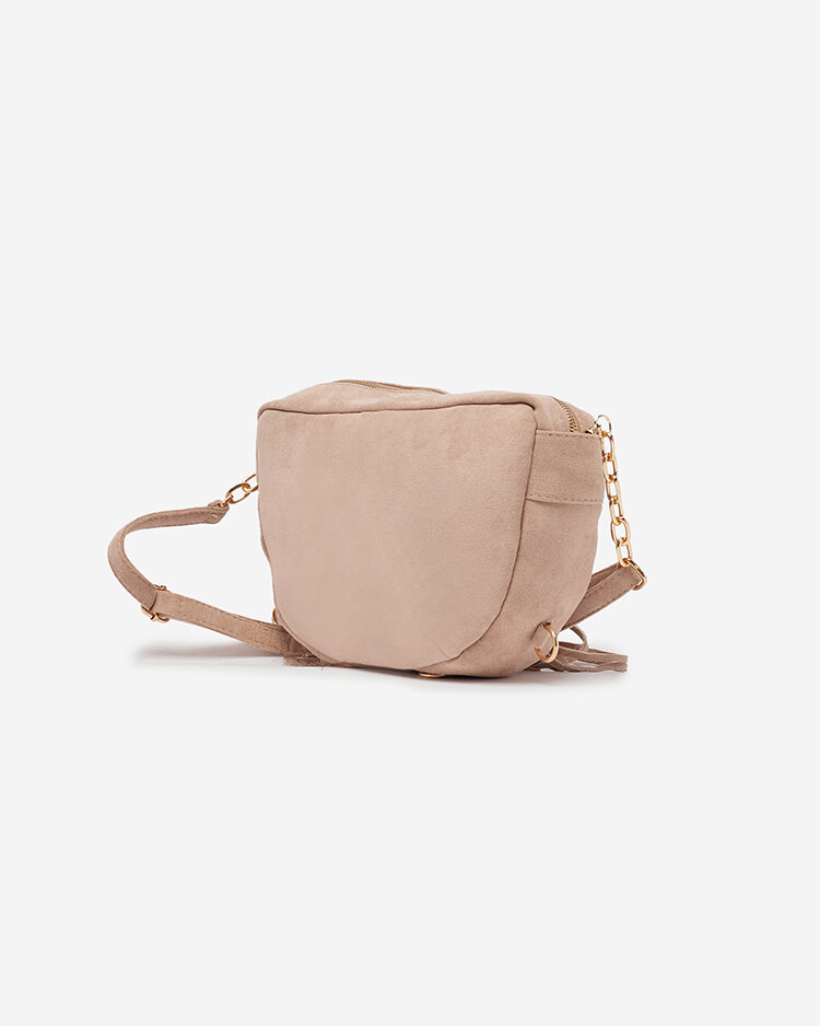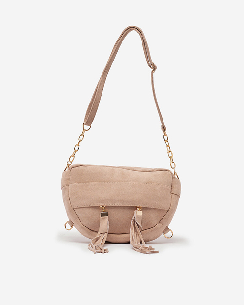 - Уникална полукръгла малка дамска чанта, изработена от екологична кожа. Моделът има 3 джоба, допълнителна регулируема каишка и декоративни пискюли. Перфектна за ежедневна употреба!