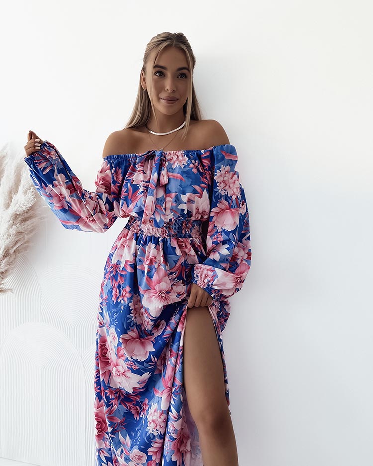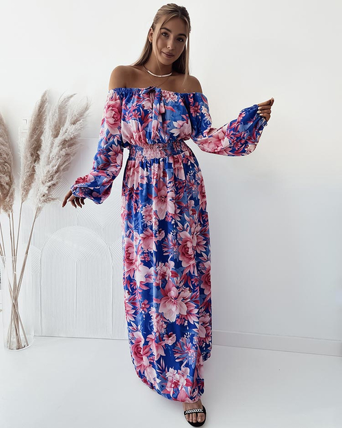 - Красива дамска рокля с отворени рамене а'ла испана, изработена от лека материя с оригинален десен. На височината на талията има широк, еластичен ластик. Продуктът е с миди дължина, има дълги ръкави и разрез отстрани.