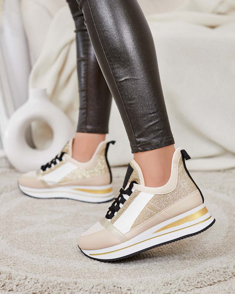 • Модерни дамски спортни маратонки на токчета, изработени от комбинация от еко кожа и плат с блясък. Вътрешна стелка от еко кожа. Те ще бъдат чудесен аксесоар за ежедневния стайлинг.