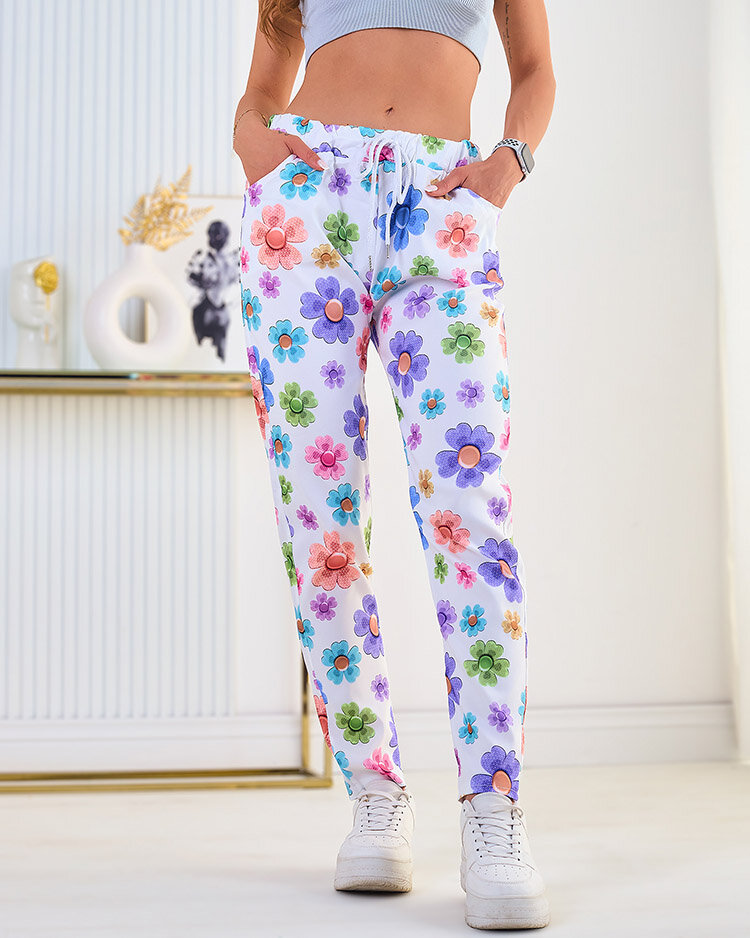 - Заострен дамски панталон с флорален десен. Моделът е със средна талия, с ластик и връзки на талията, има джобове отпред. Мода и удобство в едно!