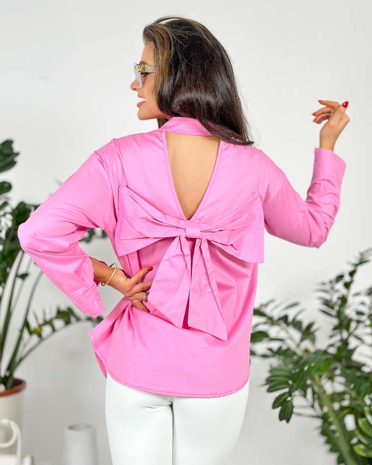 - Сензационна дамска риза с 3/4 ръкав. Моделът е с яка, закопчава се с копчета и има голяма панделка на гърба. Трябва да присъства в гардероба на всяка жена!