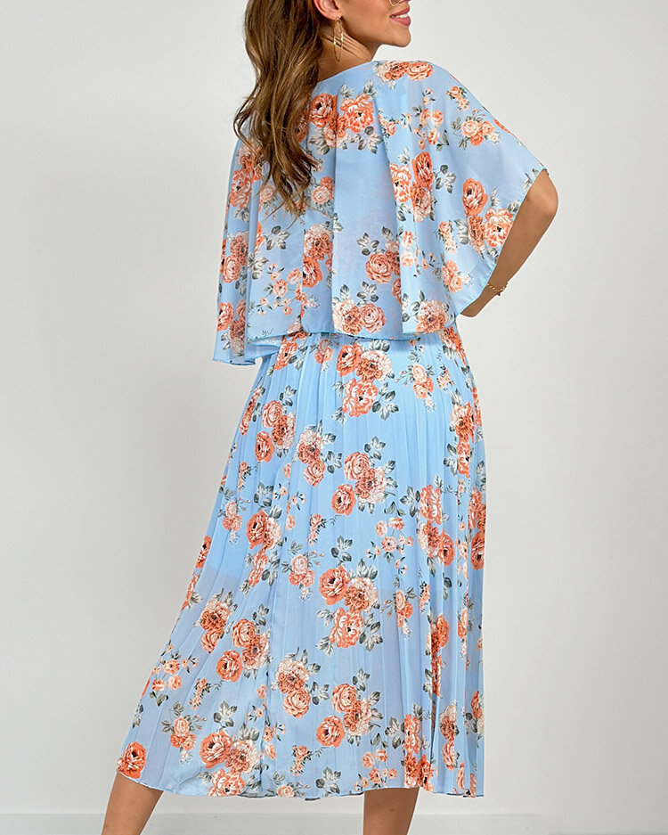 - Уникална дамска рокля от лека материя с флорален десен. На височината на талията е с ластик. Изделието е с миди дължина, има къси ръкави и плисиран кант. Почувствайте лятото в този модел!