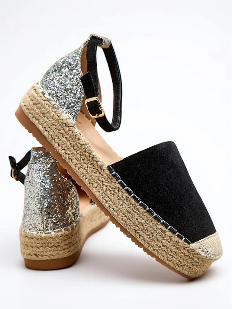 - Уникални дамски еспадрили от еко кожа и плат с блясък. Стелка от еко кожа. Плоска подметка, украсена с шнур от юта за по-голям комфорт. Закопчаване с катарама. Перфектно допълнение към летните стилове!