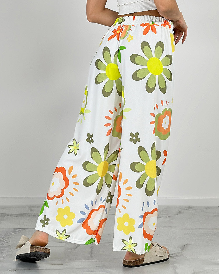 - Дамски широки панталони с флорални мотиви. Моделът е със средна талия, с ластик и връзки на талията, има джобове отпред. Мода и удобство в едно!