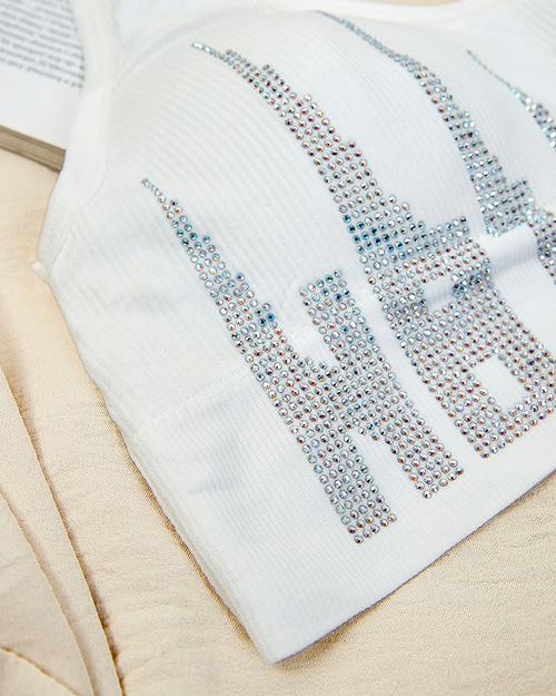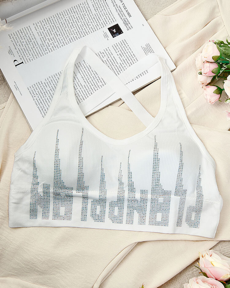 • Дамски спортен сутиен, изработен от еластичен, приятен материал. Модел с нерегулируеми, кръстосани презрамки, без закопчалка и с подвижни вложки, завършващ с широк ластик в долната част и украсен с циркони. Той ще прилепне идеално по тялото.