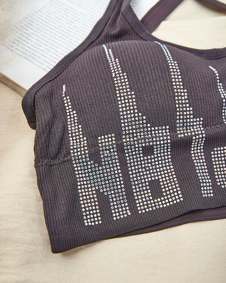 - Дамски спортен сутиен, изработен от еластичен, приятен материал. Модел с нерегулируеми, кръстосани презрамки, без закопчалка и с подвижни вложки, завършващи в долната част с широк ластик и украсени с циркони. Ще прилепне идеално по тялото.