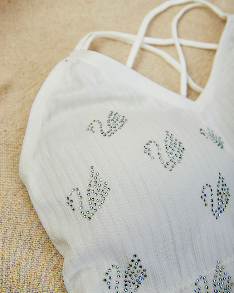 - Дамски спортен сутиен, изработен от еластичен, приятен материал. Модел с нерегулируеми, кръстосани презрамки, без закопчалка и с подвижни вложки, завършващи в долната част с широк ластик и украсени с циркони. Ще прилепне идеално по тялото.