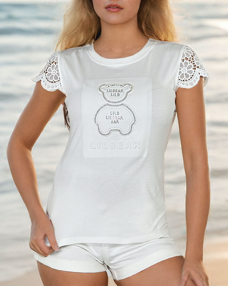 - Дамска блуза, изработена от мек материал. Моделът е с декоративен десен на мече, украсен с циркони, къси ръкави с елементи от декоративна дантела и кръгло деколте. Перфектна за ежедневно носене!