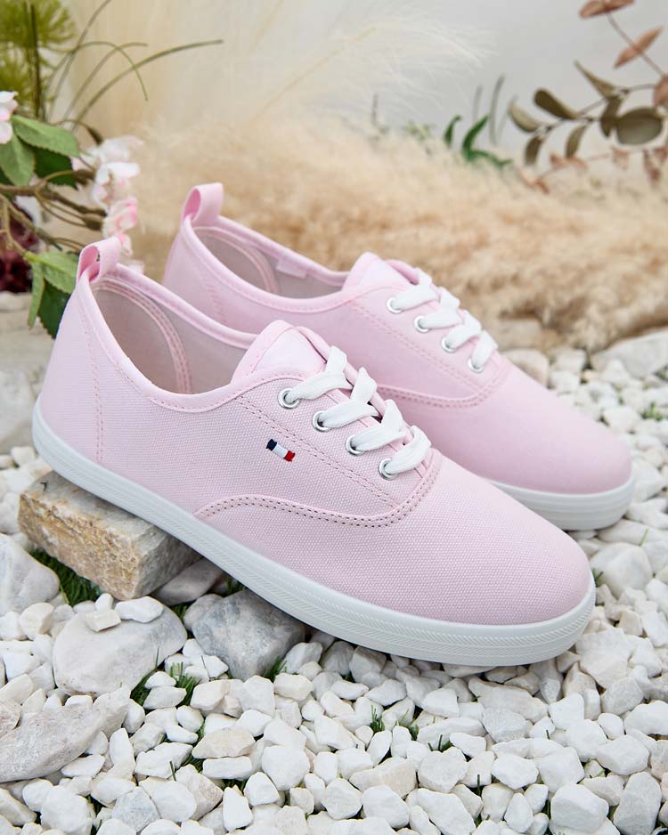 - Олекотени дамски спортни обувки в стил маратонка с плоска подметка. Горна част с дантела, изработена от плат. Вътрешна част на стелката, изработена от текстилен материал. Чудесни за летни разходки!