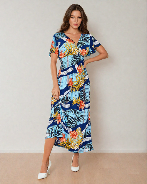 • Уникална дамска рокля, изработена от лека материя. Продукт с миди дължина, с къси ръкави и сърцевидно деколте. Моделът е украсен с принт. Почувствайте лятото в този модел!