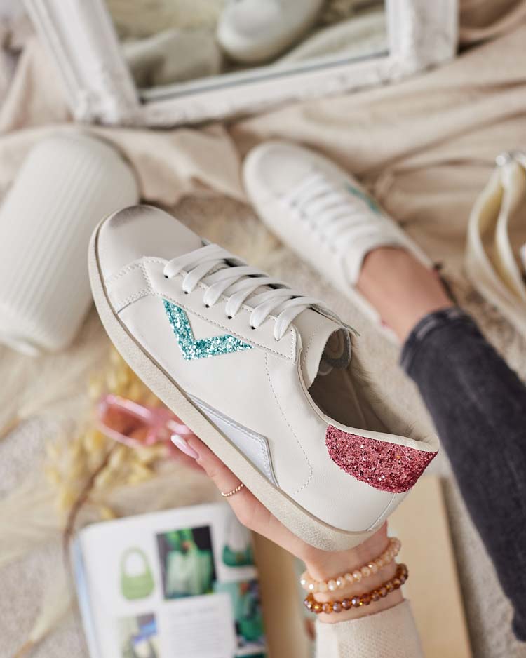 - Дамски маратонки от еко кожа на равна подметка - перфектната комбинация от стил и комфорт. Моделът е с дантела, има стелка от еко кожа. Горната част е украсена с декоративни вложки от брокат. Перфектни за ежедневните тоалети!